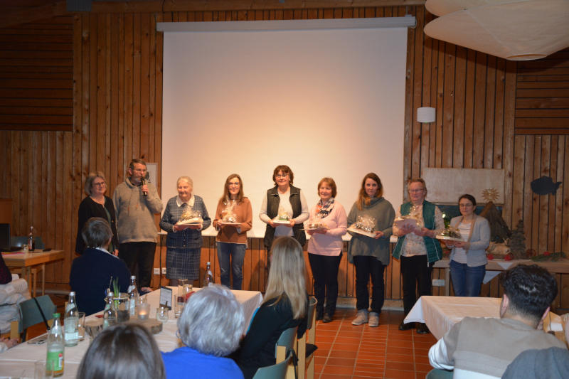 Stellvertretend geehrt wurden.v.li.: Doris Kerl, Elisabeth Pfeiffer, Renate Pfeiffer, Eine-Welt-Verkauf; Pfarrersehepaar Sabine und Johannes Hofer; Gudrun Eppner, nach 33 Jahren ausscheidende Pfarramtssekretärin; Stefan Folkerts (5J Konfileiter), Inge Jacobsen u. Sergej Gorgos (10J Konfileiter)