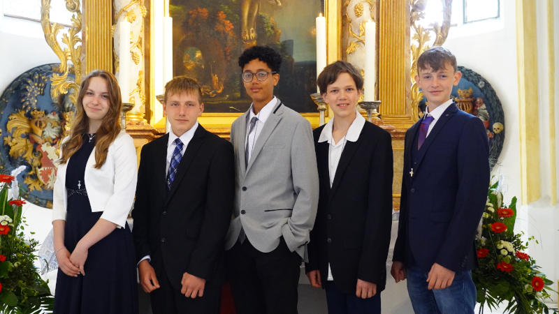 v.l.: In Ortenburg konfirmiert wurden: Emma Böttcher, Fabian Rauer, Rudolf Krempl, Elio Krempl, Korbinian Hölzel